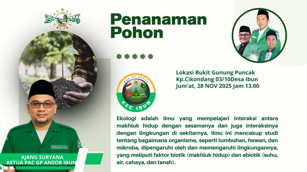 Ibun, 24 November 2025 – Pimpinan Anak Cabang (PAC) Gerakan Pemuda (GP) Ansor Kecamatan Ibun, Kabupaten Bandung, kembali menunjukkan komitmennya terhadap lingkungan dengan menggelar kegiatan penanaman pohon massal di kawasan kritis Bukit Benteng, Desa Ibun. Aksi penghijauan ini dilaksanakan pada hari Senin, 24 November 2025, sebagai bagian dari upaya pelestarian alam dan mitigasi bencana ekologis.